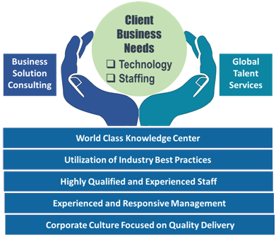 We like to think of ourselves as two hands supporting your business. The left hand provides the Business solutions, management consulting, and IT Technology Consulting, while the right hand provides the Global Talent Services, Staff Augmentation, and Workforce Management. Sage Group Technologies is small enough so that the right hand always knows what the left hand is doing and vice versa, but it is large enough to meet the complex and diverse needs of large global businesses.